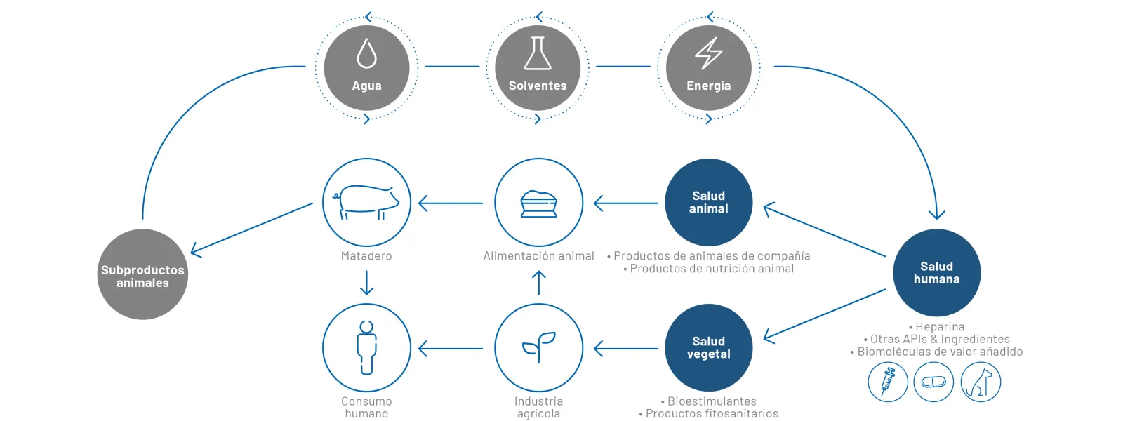 Bioiberica es una compañía integrada verticalmente, y centrada en la extracción de biomoléculas de elevado valor biológico y terapéutico. Hoy contamos con más de 100 productos que mejoran la salud de personas, animales y plantas. En este sentido el sistema de producción de Bioiberica actúa como una auténtica biorrefinería extrayendo el máximo valor de cada de las biomoléculas presentes en los tejidos animales. De igual manera que en las refinerías de petróleo se obtiene una gama de productos (combustibles líquidos y gaseosos, alquitranes, monómeros para plásticos, etc.) a partir de crudo, en Bioiberica extraemos desde principios activos farmacéuticos (heparina, condroitín sulfato, etc.) hasta extractos de proteínas para nutrición animal o para la producción de bioestimulantes para Salud Vegetal a partir de coproductos de origen animal generados por industrias alimentarias.