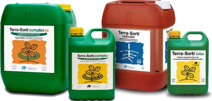 - Terra-Sorb® complex: Es un producto con una muy elevada concentración de aminoácidos libres y micronutrientes. Su acción es rápida y presenta una elevada compatibilidad en mezclas. Aumenta la actividad fotosintética y el contenido en clorofila, aporta una rápida recuperación frente a situaciones críticas, mejora la calidad del cuajado por su alto contenido en Boro (B) y mantiene el equilibrio entre la bioestimulación y la aportación de nutrientes en los momentos más críticos para el cultivo.